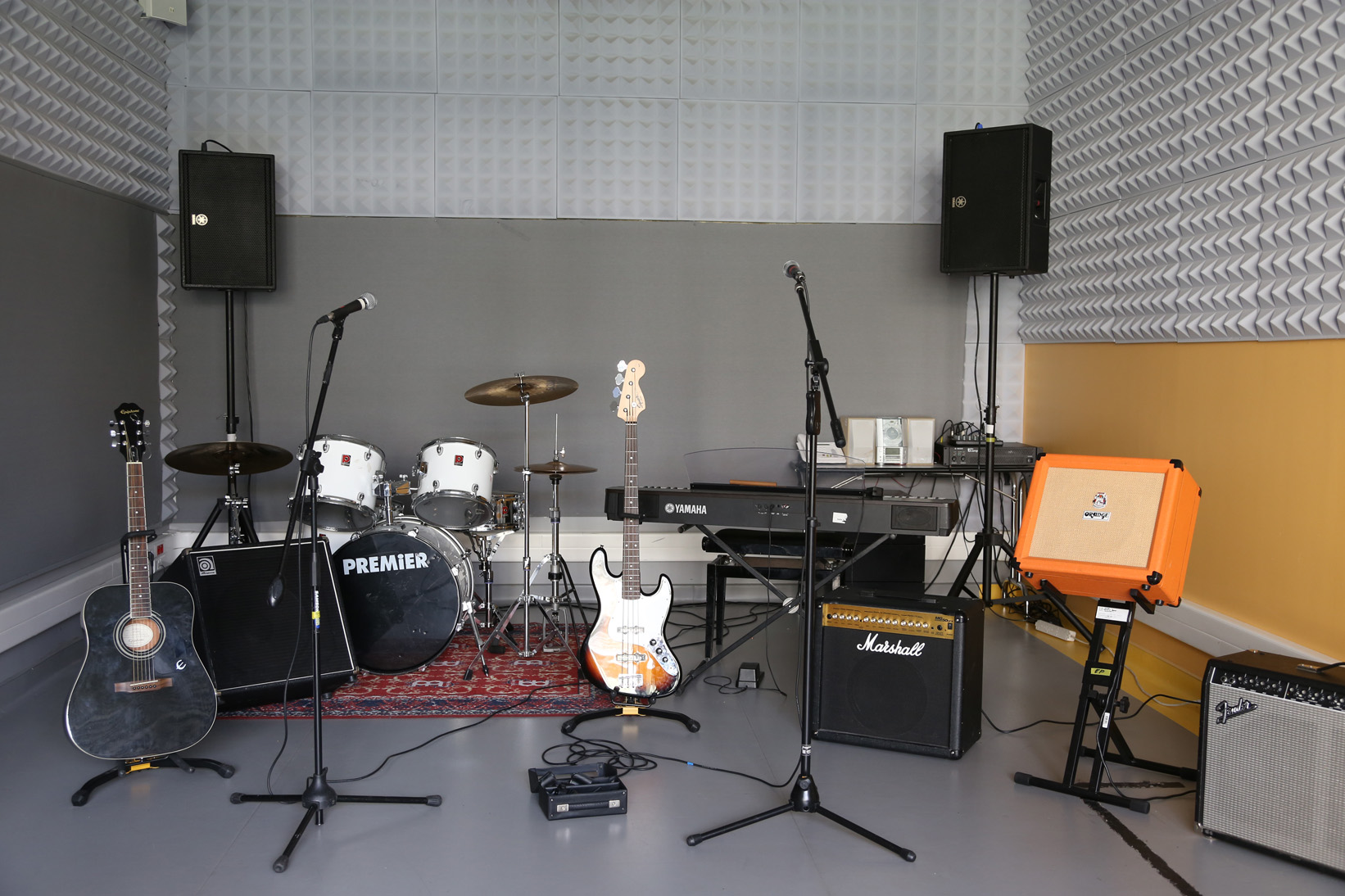 - Équipé d’un système de sonorisation, d’une batterie complète, d’un clavier Kawai, d’un ampli basse/clavier et d’amplis guitare, de micros et pupitres.